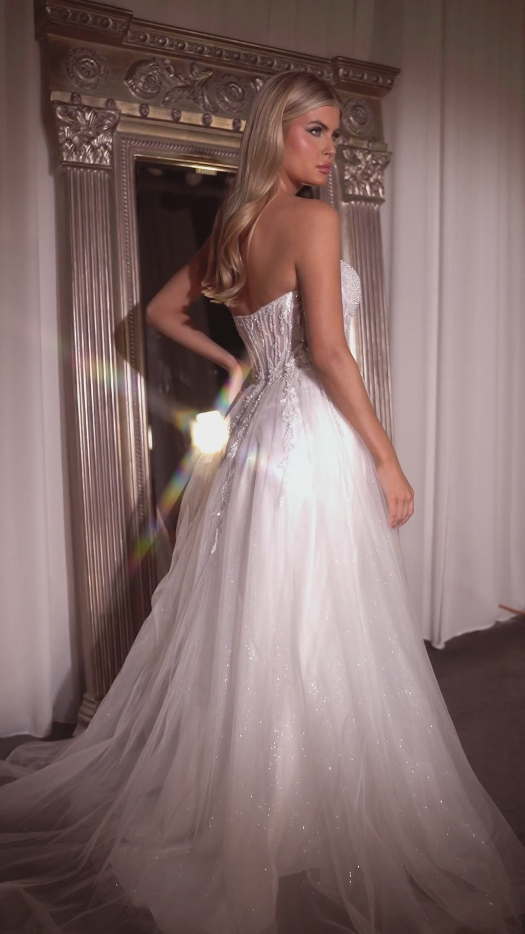 This enchanting Natalie strapless A-line ball gown features a layered glitter tulle skirt that shimmers beautifully with every step. The fully beaded bodice showcases intricate beadwork detailing, while the plunging neckline adds sultry charm. This timeless design captures opulent elegance, creating the perfect fairytale romance for your special day.