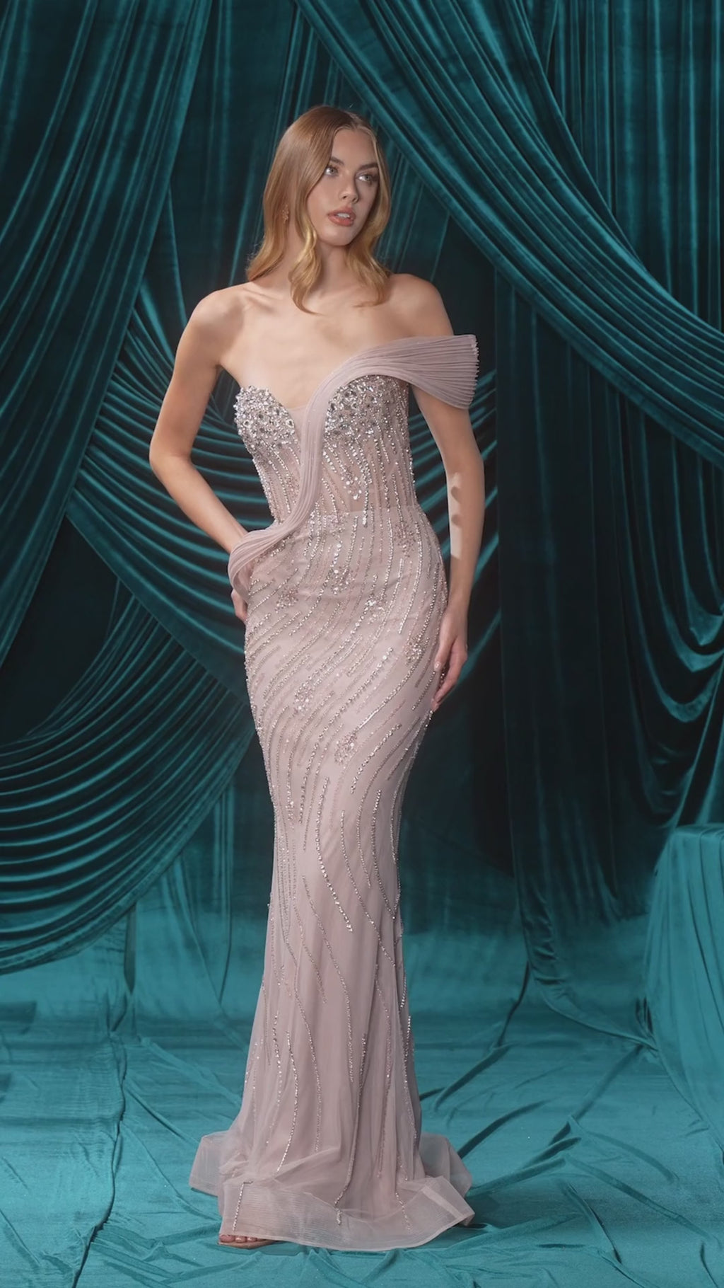 The Aemilia gown blends romantic sparkle with sculptural elegance. This fitted silhouette features a sweetheart neckline and an asymmetric pleated wrap detail that adds couture-inspired dimension to the bodice. Crystal and bead embellishments shimmer across the tulle overlay, while softly cascading sequin lines elongate the figure with radiant movement.