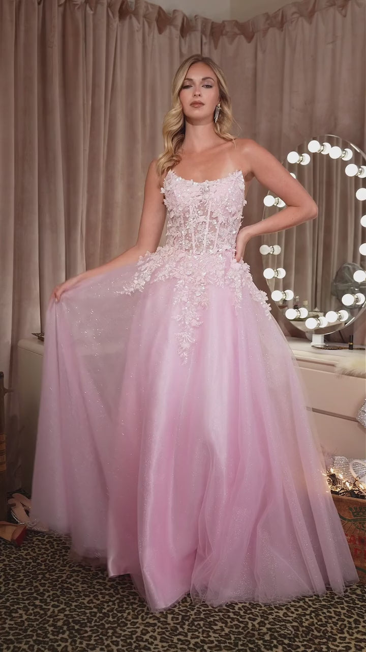 Designed to enchant, the Avonlea gown features a scoop neckline and a beautifully embellished bodice with dimensional floral appliqué that catches the light from every angle. The glitter tulle skirt flows into a full A-line silhouette, creating a dreamy, fairytale presence with every step. Finished with a lace-up corset back for customizable structure and support, this gown blends romance and elegance—perfect for prom and unforgettable formal celebrations.