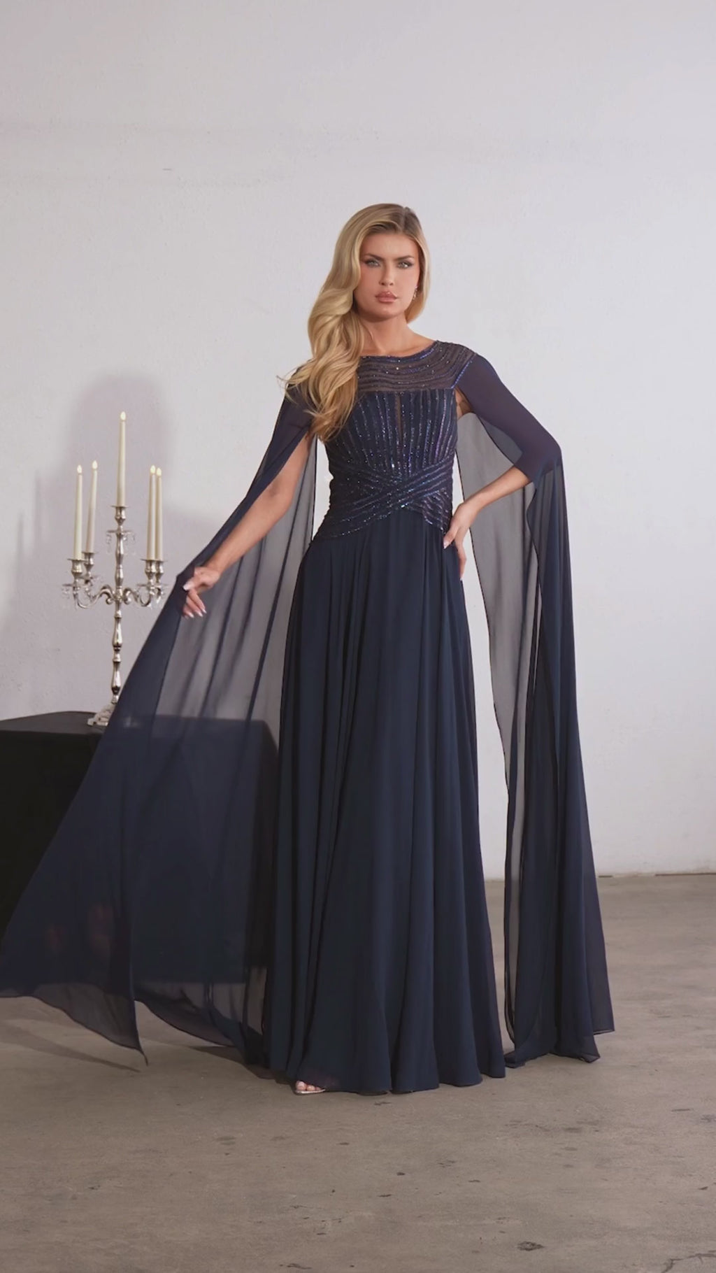 Command the room in the Berkley gown, an elegant A-line silhouette featuring a bateau neckline and a shimmering beaded bodice with intricate crystal detailing. Flowing cape sleeves cascade from the shoulders for dramatic movement, while the soft floor-length skirt delivers timeless sophistication. A stunning choice for galas, black-tie evenings, and mother-of-the-bride moments.