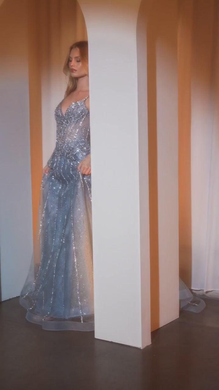 Elegant and luminous, the Halston gown features a flattering V-neckline, thin straps, and delicate linear crystal embellishments that add a touch of sparkle. The structured bodice cinches at the waist and cascades into a full layered tulle skirt, creating a graceful and romantic A-line silhouette. Timeless and glamorous, this gown is perfect for prom, black-tie events, and elevated formal occasions.