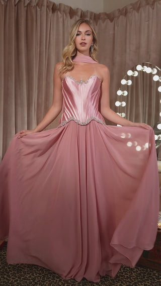Timeless and enchanting, the Jessenia gown blends regal sophistication with classic ball gown drama. The sculpted satin corset bodice is adorned with delicate crystal embellishments along the neckline and waist, flowing into a full chiffon skirt that moves with airy grace. Finished with a strapless neckline and lace-up back for a customizable fit, this style is perfect for prom, galas, and grand formal celebrations.