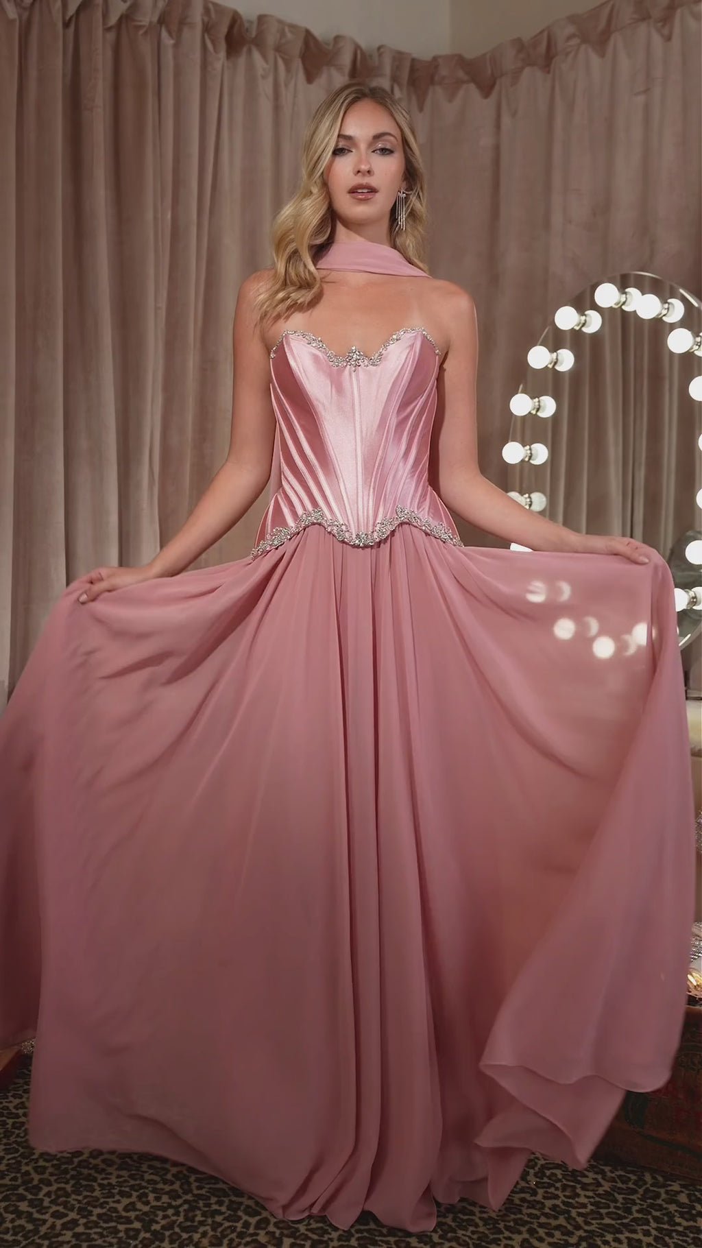 - Fabric & Material: Satin corset bodice with chiffon skirt