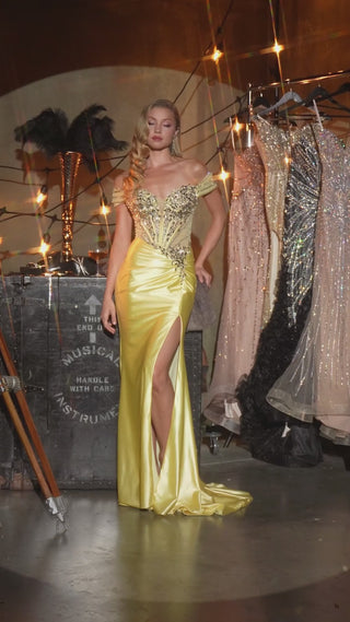 - Design: Off-the-shoulder neckline with beaded bodice & thigh-high slit