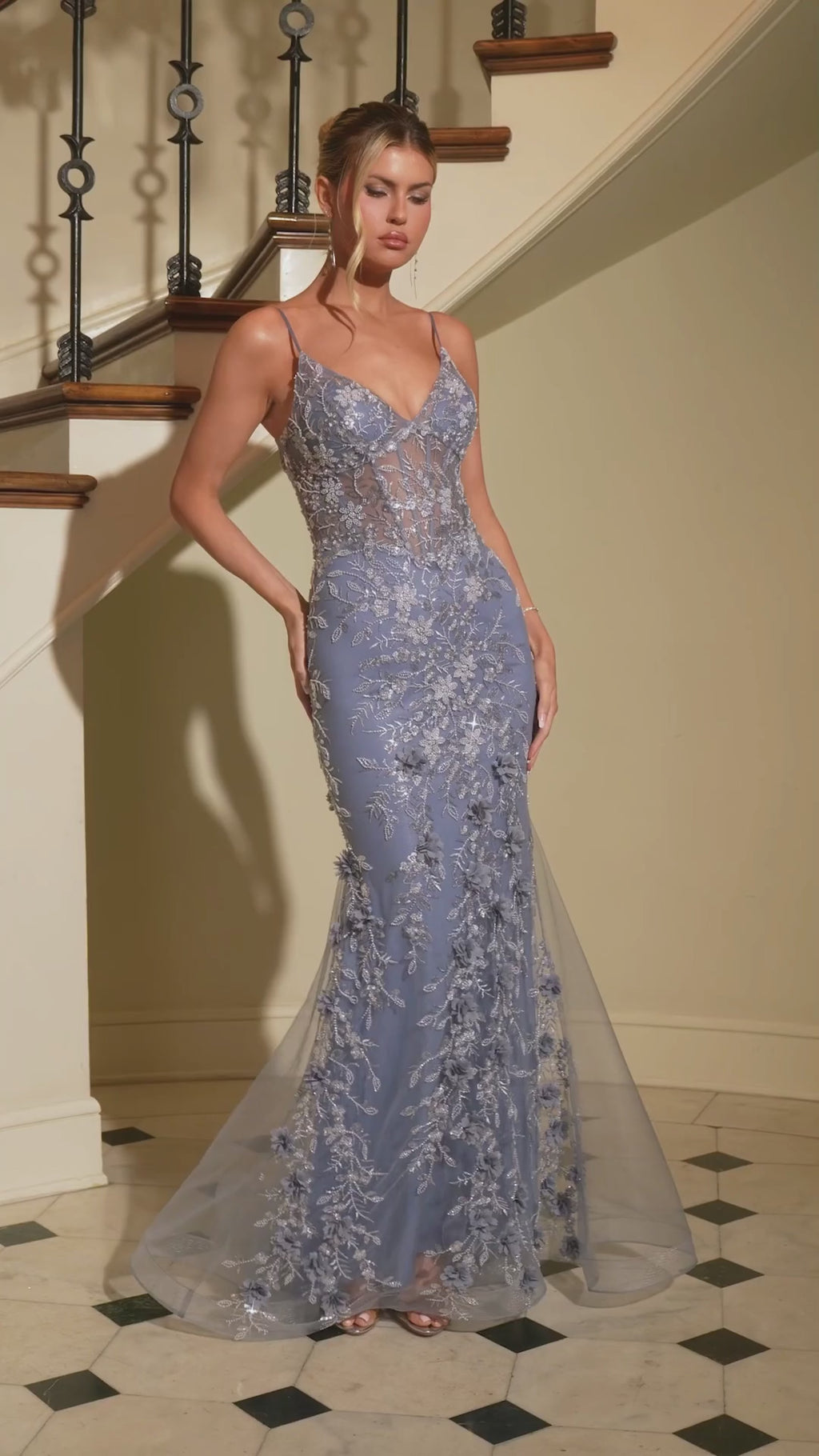 Captivate the room in the Caprice by Ladivine, a fitted gown designed to mesmerize with its romantic, light-catching details. The delicate V-neckline and dimensional 3D floral appliqué create a soft, sculpted look, while shimmering beadwork trails over a sheer tulle base for an ethereal glow. A lace-up corset back provides adjustable support and enhances the figure, flowing into a sweeping illusion train that adds dramatic elegance. Perfect for prom, pageants, or upscale formal events, this gown blends modern romance with timeless sophistication.