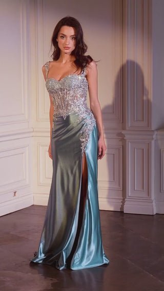Exude refined sophistication in the Leona fit-and-flare gown, featuring a sweetheart neckline, delicate straps, and a sheer bodice adorned with intricate lace appliqué and crystal beading. Crafted from soft stretch satin, the design hugs the figure with elegance, while the pleated back hip and graceful leg slit add a dramatic finish. Perfect for galas, black-tie events, or prom, this gown balances timeless beauty with modern allure.