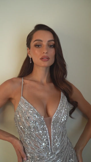 - Design: Plunging neckline, thin straps & body contouring embellishment