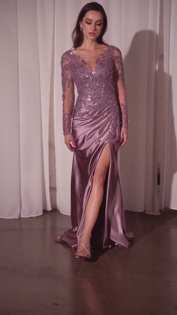 The Camille dress is timeless sophistication. This fitted gown features long sleeves and a plunging V-neckline, beautifully highlighted by an embellished lace bodice. The stretch satin skirt drapes effortlessly, complete with a pleated waistline and a chic leg slit that flatters every curve. Elegant and refined, this gown is perfect for galas, black-tie events, or any special occasion where you want to leave a lasting impression.