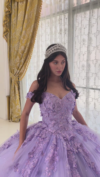 Float into your fairytale moment in this exquisite off-the-shoulder butterfly Lucinda Quinceañera gown! The distinctive sweetheart neckline adorned with delicate lace appliques creates an instantly regal presence. Soft layers of tulle form a dreamy full skirt that moves like clouds with every step, while the delicately appliqued trimmed train adds an enchanting finishing touch that gracefully follows behind you. This magical gown perfectly captures your inner princess, whether for your Quinceañera or any treasured celebration.