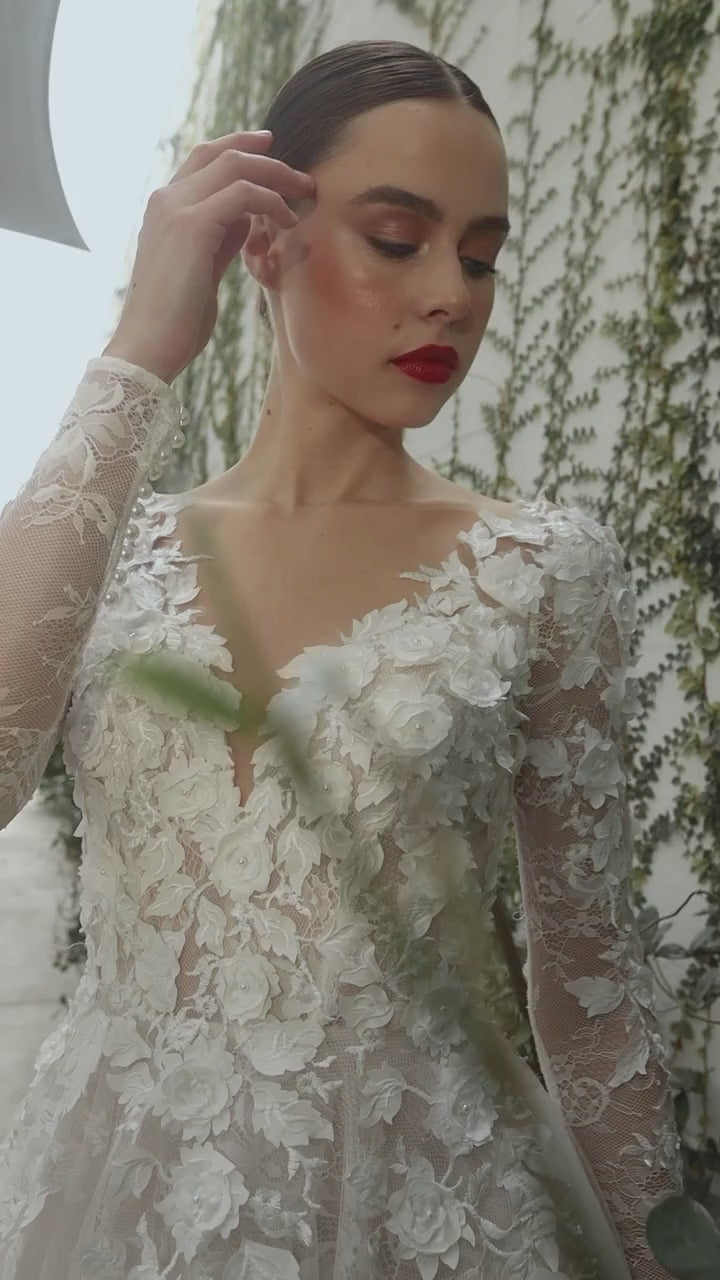 Fall deeply in love with this hopelessly romantic Violet gown adorned with stunning white florals. The enchanting design features delicate 3D floral vines that gracefully cascade along sheer sleeves and complement the soft A-line silhouette. A classic V-neckline beautifully edged with flower petals perfectly frames and accentuates your natural beauty. The subtle nude-toned lining adds an alluring sensual touch to this exquisitely crafted gown, creating a perfect balance of romance and sophistication!